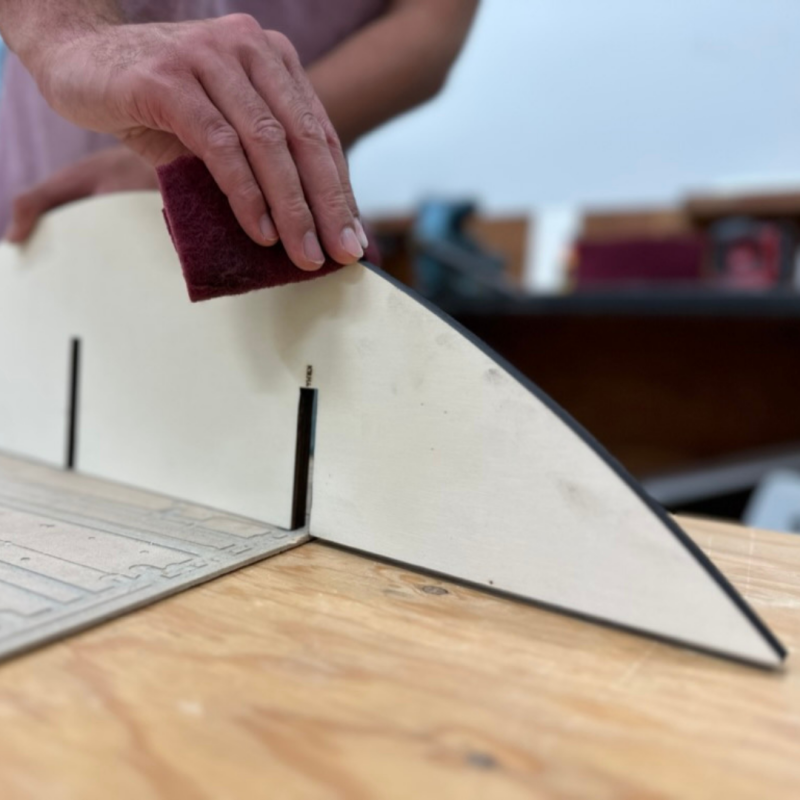 Door het lasersnijden zijn de randen verkoold. Daarmee krijgen deze randen de kenmerkende zwarte kleur, maar geeft het ook af. Daarom maken schuren we de randen eerst ligt, waarna we de randen met een blanke olie bewerken. Zo zijn de randen beschermd en geven ze niet meer zwart af op je handen of je muur. Nadat de randen zijn beschermd kan de kast geschuurd worden. Door het laseren ontstaan er verbrande plekjes op het hout die je na het schuren helemaal niet meer ziet.